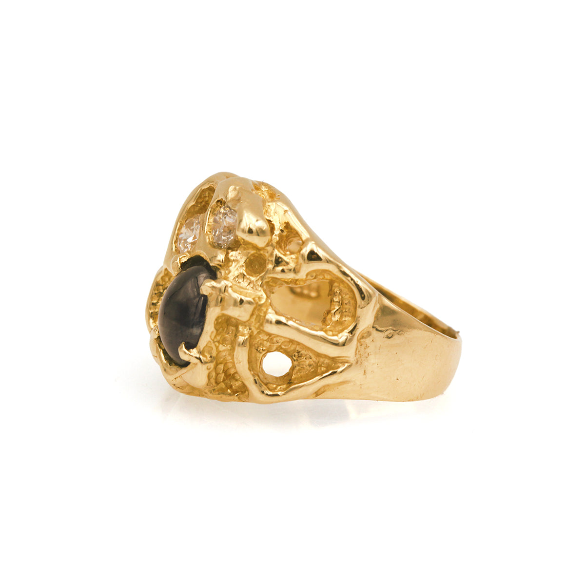 The unique, artful “nugget” shape of this ring is cast in sumptuous 14K yellow gold. Nestled within the gold is a sapphire oval cabochon with color so rich and deep you can practically see the future in it. Accented by two sparkling white diamonds. This is a one-of-a-kind estate item, fully restored to a showroom finish, with an appraised value of $6,918.