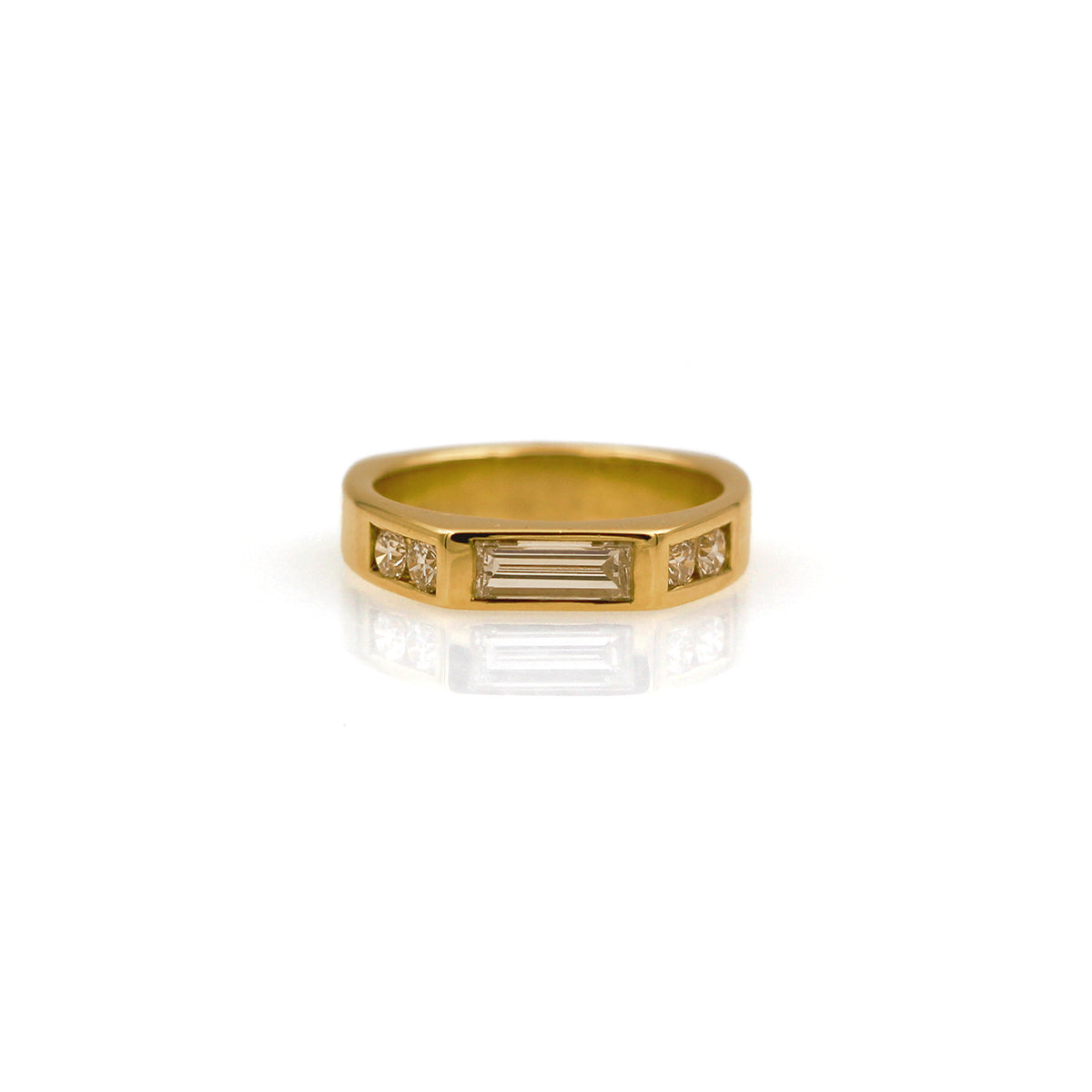 We love the alluring modernist geometry of this 14K yellow gold band, and especially the way its hard angles culminate in long baguette-cut diamond. That center stone is flanked on both sides by a pair of round cut diamonds for even more sparkle! This is a one-of-a-kind estate item, fully restored to a showroom finish, and has an appraised value of $7,585.