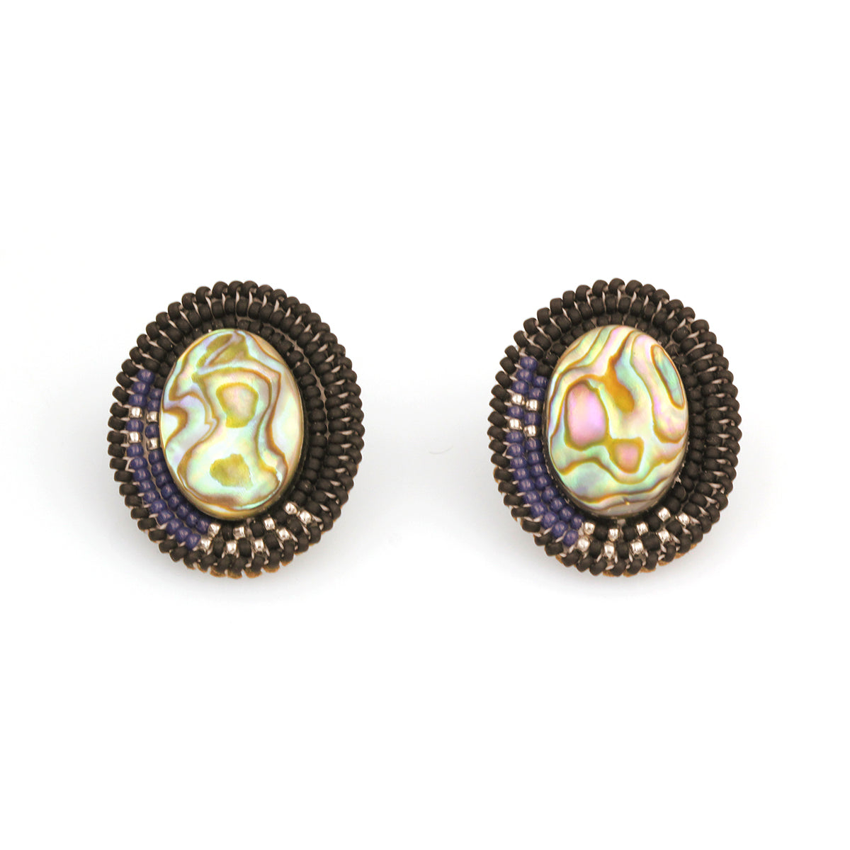 “Bold and mesmerizing, the Raven Abalone Statement earrings feature a deep black and blue pattern wrapped around a gorgeous abalone shell center. The design is inspired by the feathers of a Raven.”