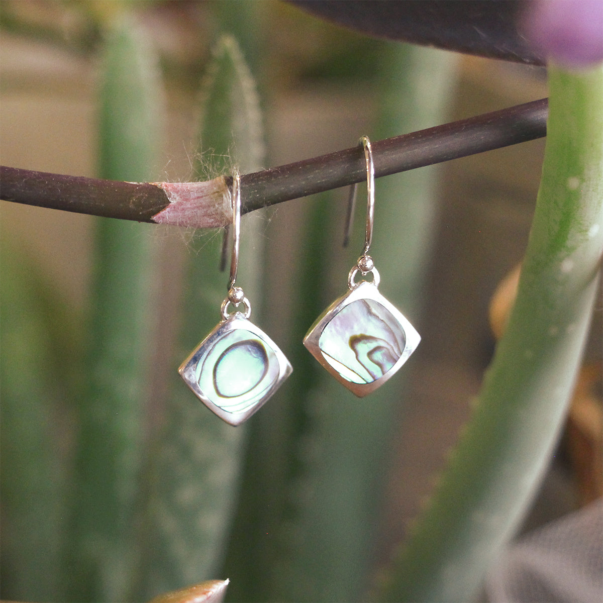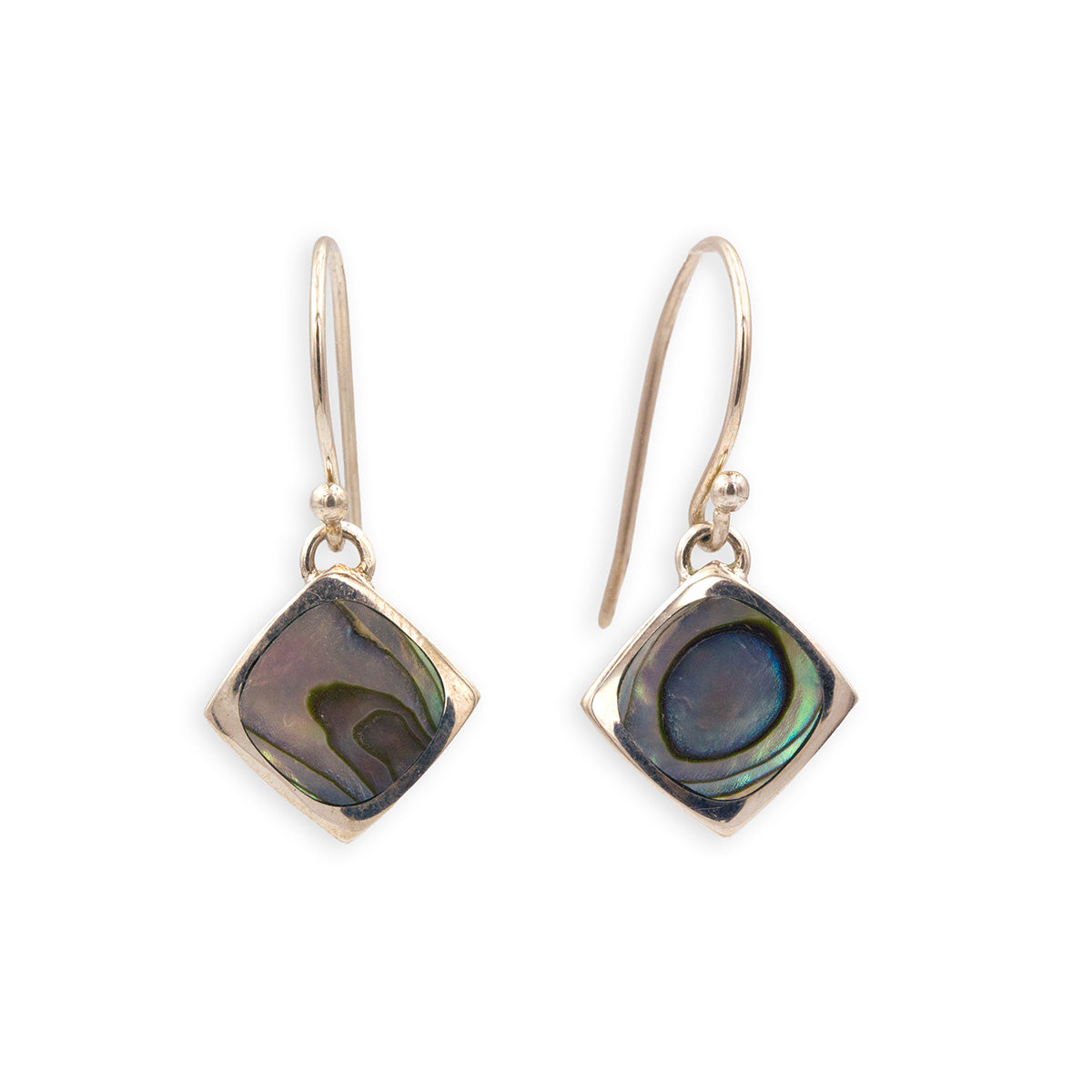 These versatile drop earrings feature squares of colorful abalone hung at a 45 degree angle, set in sterling silver, and hung from sterling silver hooks.
