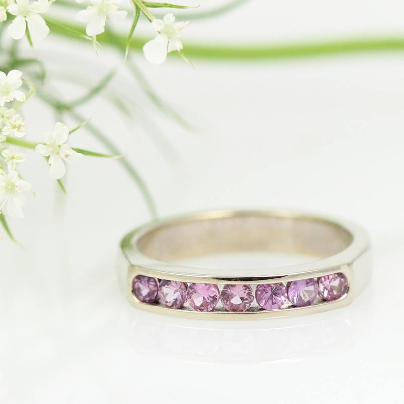 This sweet anniversary band features seven rosy pink sapphires channel-set in 14K white gold. Great as an alternative wedding band, or as part of a custom stack! Handmade by us in our Ann Arbor, Michigan-based studio.