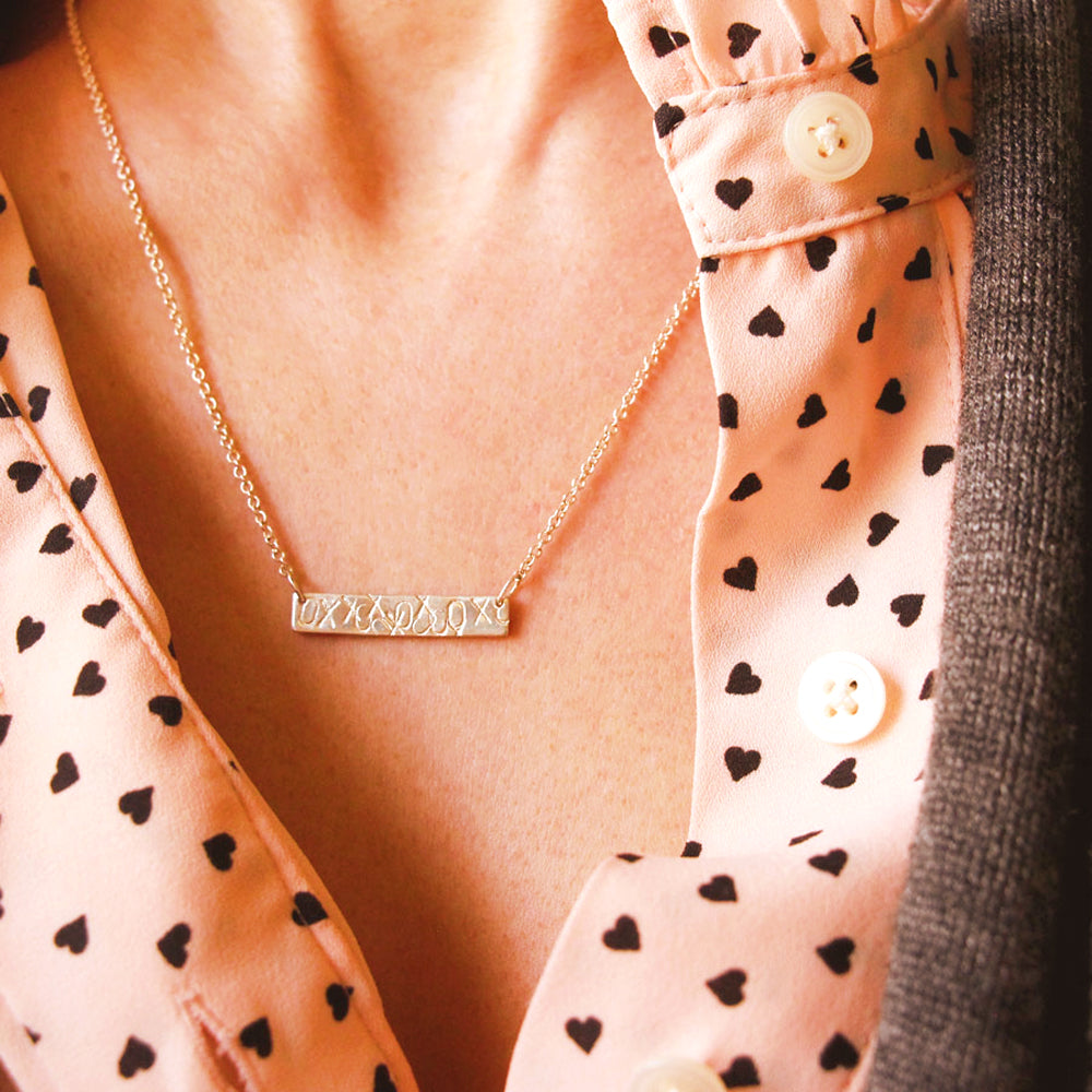 This sterling silver bar necklace is imprinted with charming Xs (kisses) and Os (hugs). Perfect for a loved one, or tell the world that you've got love to spare. Handmade by Abra-exclusive artist MOROKA, a mother/daughter/daughter team committed to creating beautiful jewelry for all.