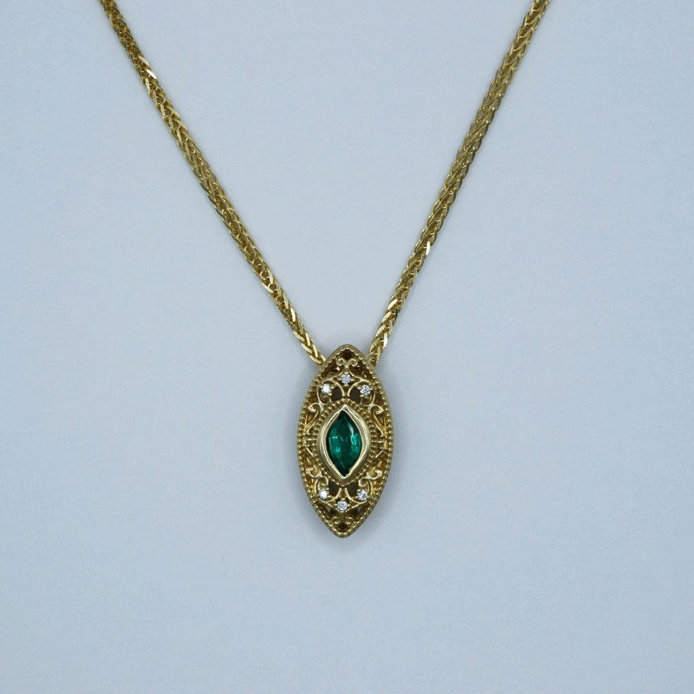 In this pendant, a stunning Brazilian emerald is offset by laboratory-grown diamonds and delicately scrolling golden details.