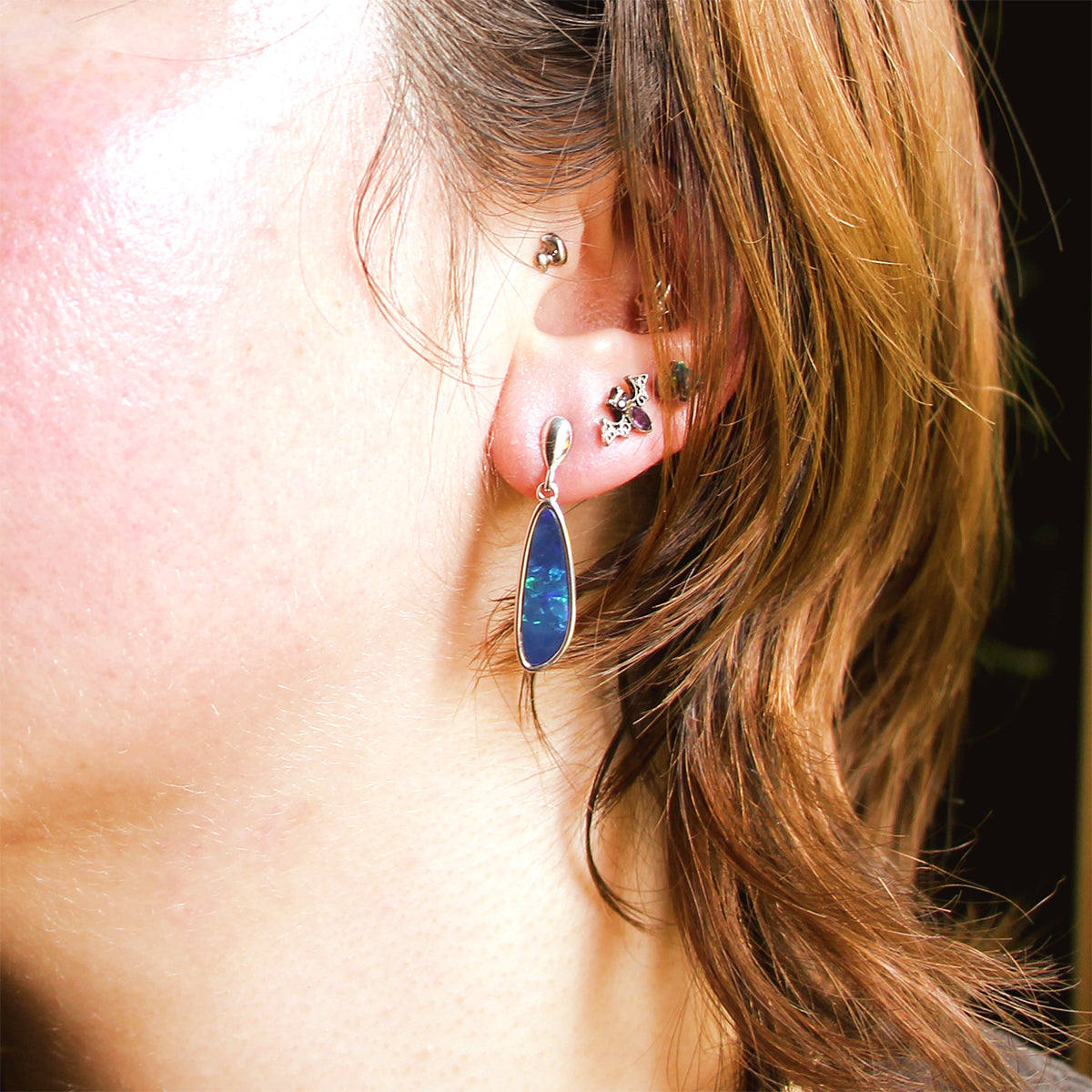 These opulent drop earrings showcase teardrop-shaped opal doublets with rich watery color flash, bezel set in sterling silver and hung from sterling silver studs.