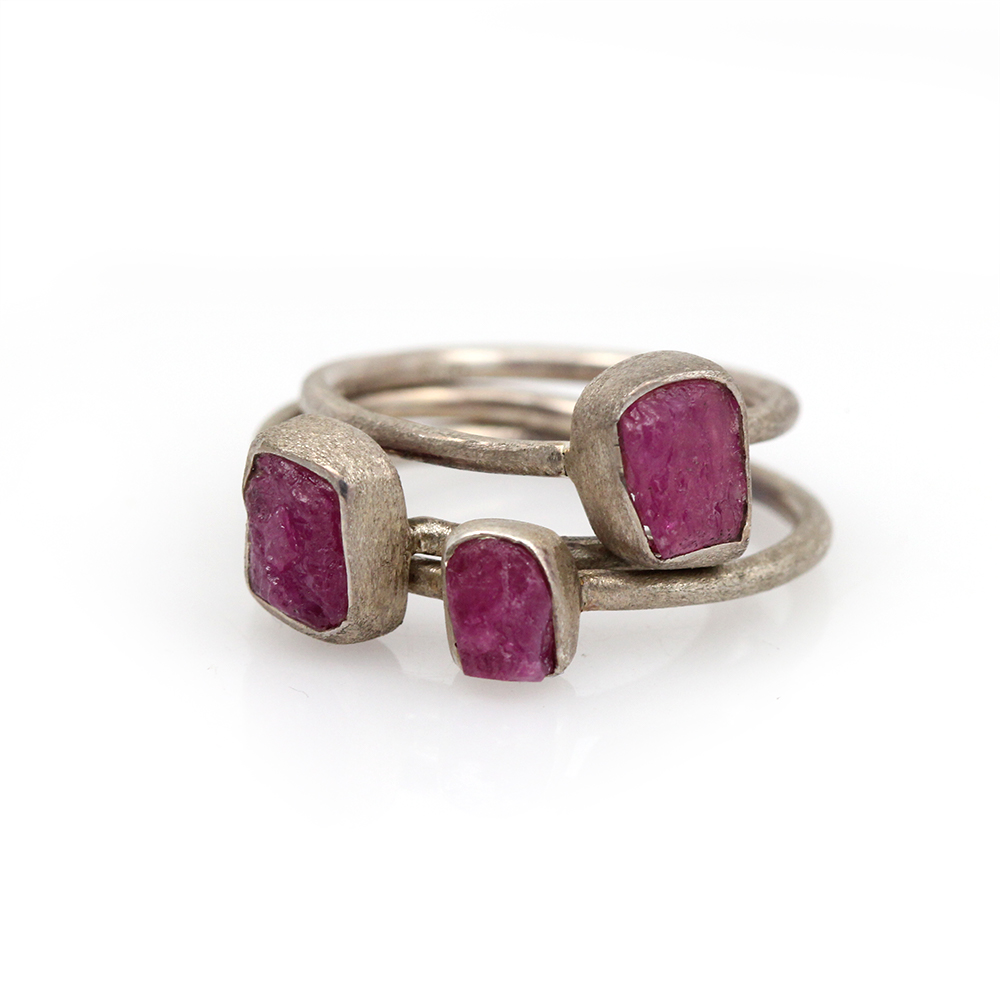 A sterling silver ring featuring a one-of-a-kind raw ruby nestled in matte-finished sterling silver. Ideal for stacking! Handmade by Abracadabra-exclusive artist MOROKA, a mother/daughter/daughter team committed to creating beautiful jewelry for all.