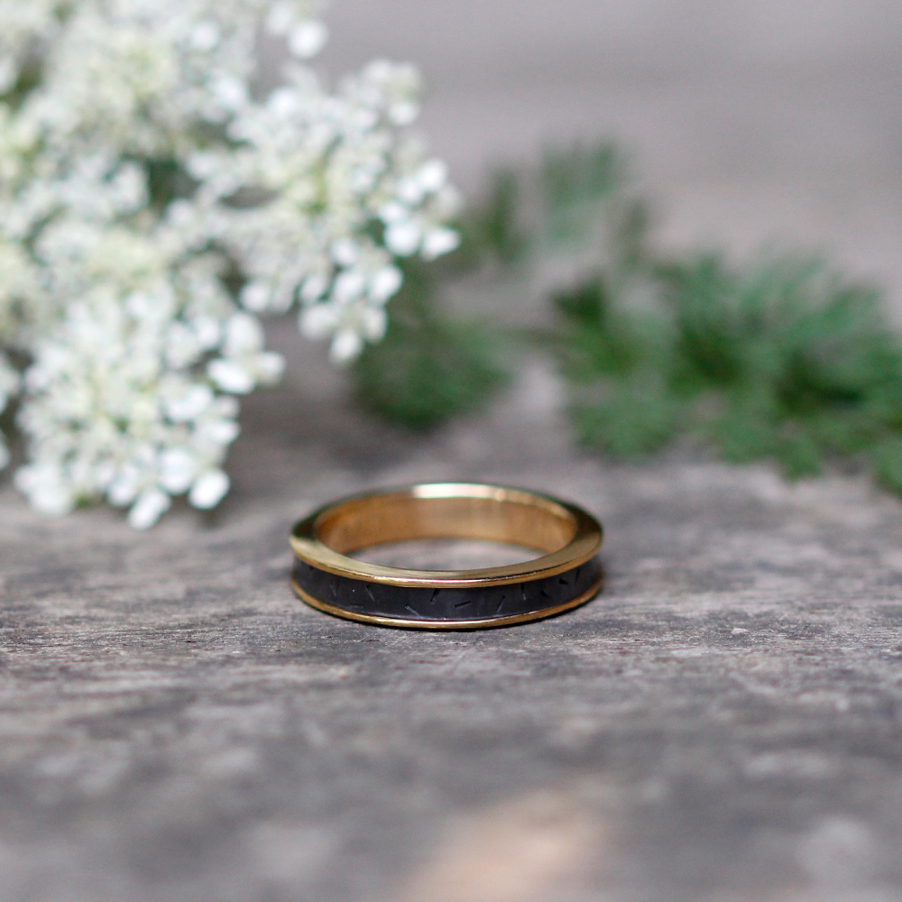This slim and stackable ring features a 14K yellow gold liner with a one-of-a-kind textured niobium inlay. Crafted in 14K yellow gold and handmade by us in our Ann Arbor, Michigan-based studio.