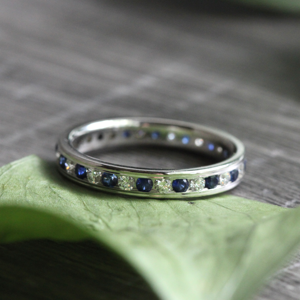 This stunning eternity band is crafted in shimmering 14K white gold, featuring alternating channel-set blue sapphires and white diamonds. Perfect alone, or as part of your custom ring stack. Please note, this style cannot be sized.