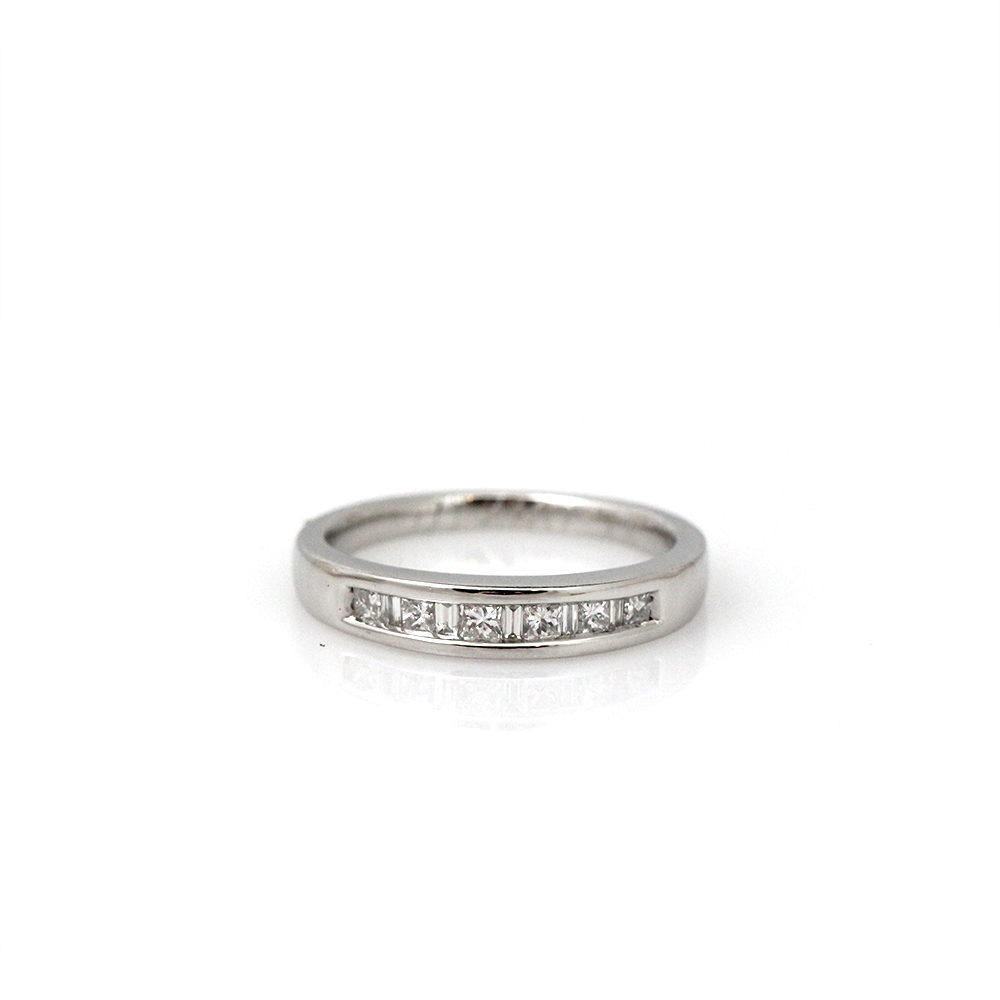 Add some sparkle to your stack with this sleek anniversary style ring and its channel-set, princess cut diamonds. It also looks great on its own. This is a one-of-a-kind estate item, fully restored to a showroom finish, with an appraised value of at least $3,668.