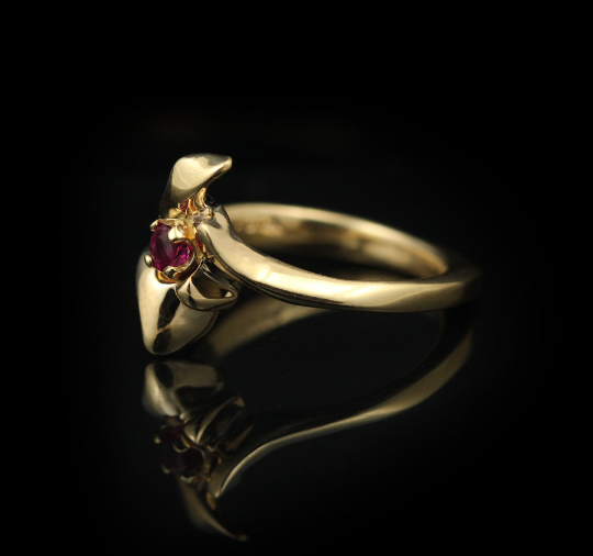 A red ruby tinged with pink sparkles in the center of this hand-carved floral ring design. Perfect as an alternative engagement ring, or just a fashion ring for you July birthstone babies. Crafted in 14K yellow gold and handmade by us in our Ann Arbor, Michigan-based studio.