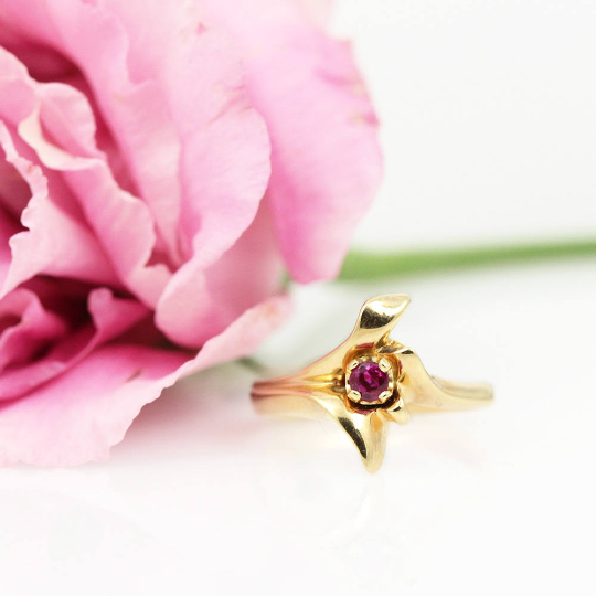 14K Yellow Gold Floral Ruby Solitaire Ring