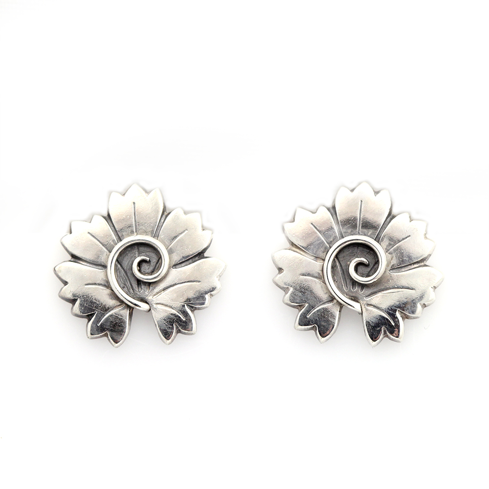 These carefully crafted early 20th century sterling silver floral clip-on earrings were designed by Arlo Malinowski for Georg Jensen. Fully hallmarked and stamped with Denmark 102 and in excellent condition. Originally trained as a sculptor and medalist, Arno Malinowski worked for Georg Jensens renowned silversmithy from 1936-1944, and again from 1949-1965. His work was known for naturalistic motifs such as flowers and animals imbued with a geometric edge. Malinowski is most well-known for designing Copenhagen's famous Kingmark, an emblem worn by Danes during WWII to show their loyalty to Denmark and their resistance to the German Occupation.