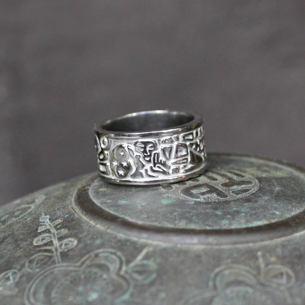 This 10mm wide ring band depicts Gustav Klimt's famous painting 'The Kiss' in exquisite detail, appealing to the romantics and art lovers in all of us. Crafted in hypoallergenic palladium. Handmade by us in our Ann Arbor, Michigan-based studio.