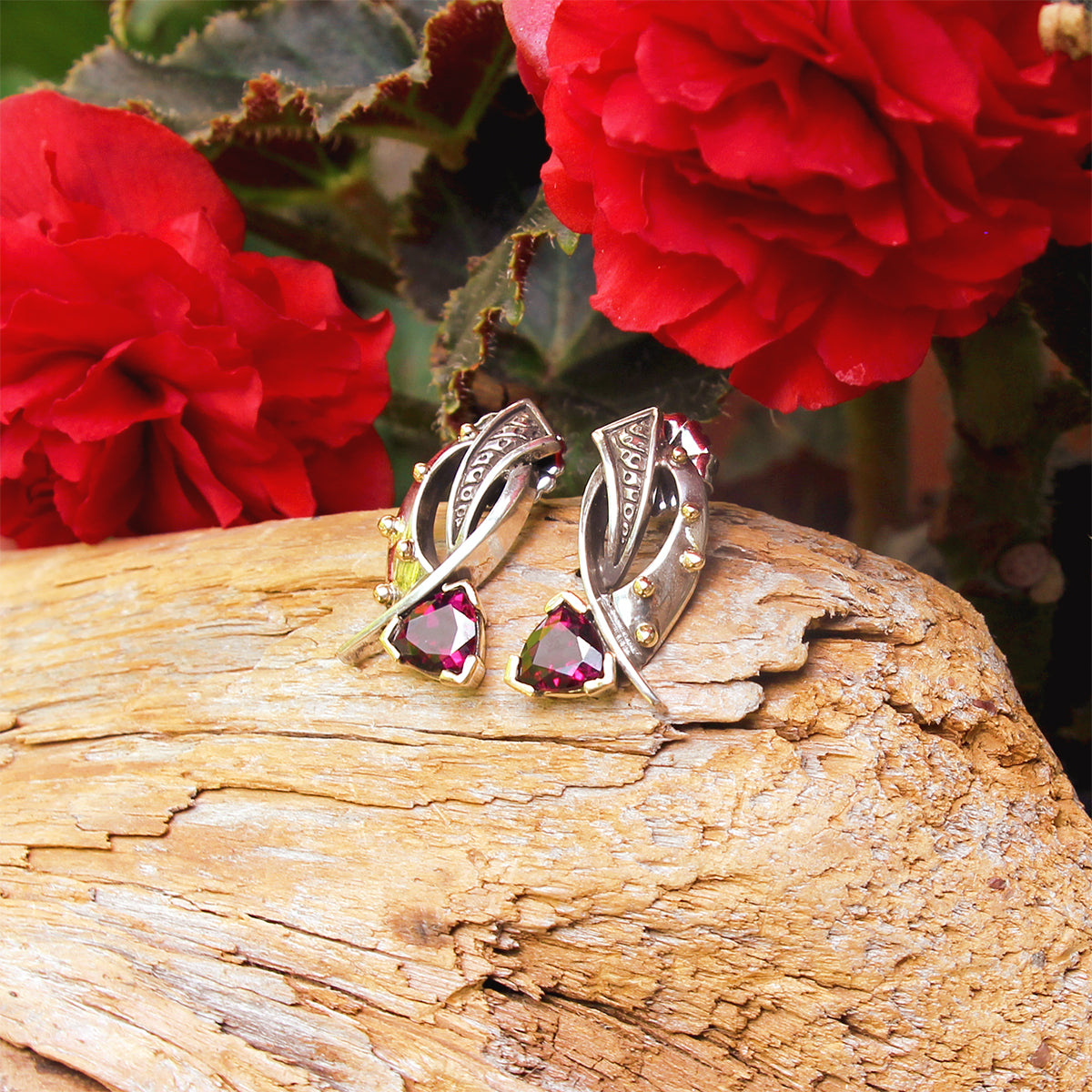 These wildly original earrings pair a variety of artful textures in sterling silver, accent them with 14K yellow gold, and bring it all together with a gorgeous trillion cut garnet. A bold statement, but without sacrificing elegance. This is a one-of-a-kind estate item, fully restored to a showroom finish, with an appraised value of $2,478.