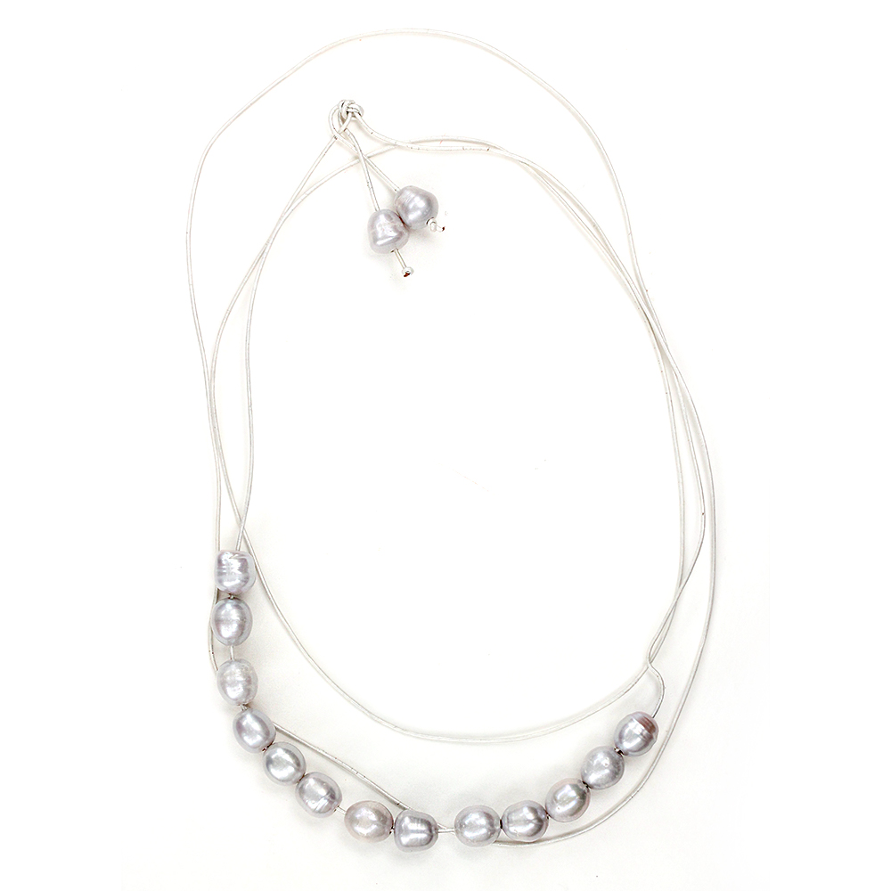 This light and lustrous selection of baroque grey freshwater pearls is strung on white leather. Handmade by Abracadabra exclusive artist MOROKA, a mother/daughter/daughter team committed to creating beautiful jewelry for all.
