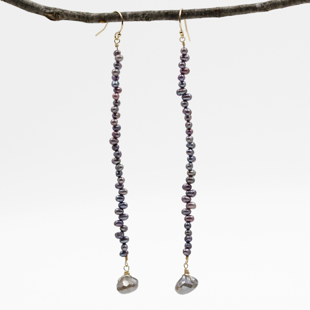 These straight line shoulder duster earrings feature iridescent purple-hued freshwater seed pearls and a labradorite dangle. Handmade by Abracadabra-exclusive artist MOROKA, a mother/daughter/daughter team committed to creating beautiful jewelry for all.