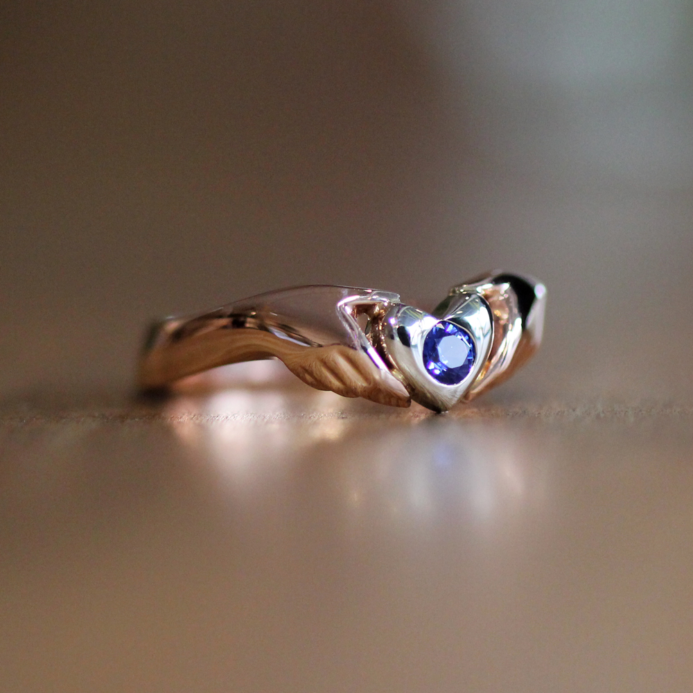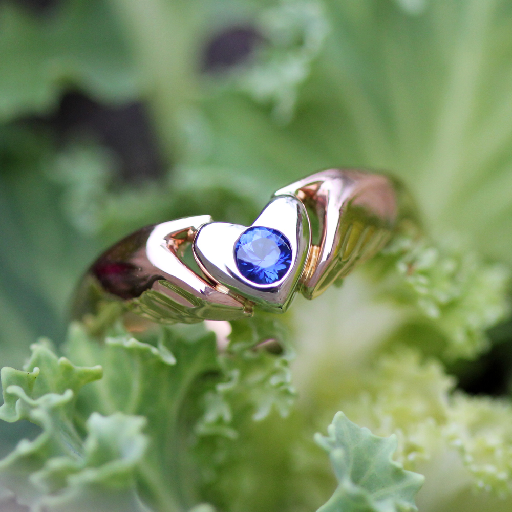 Our take on this traditional Irish symbol of love, loyalty, and friendship is crafted in rose and white gold and crowned with a brilliant blue sapphire. Clasped hand rings have been used since Roman times to symbolize the pledging of vows and served as engagement and wedding rings in medieval and renaissance Europe. Handmade by us in our Ann Arbor, Michigan-based studio. We use recycled metal and ethically sourced gems to make heirloom quality jewelry.