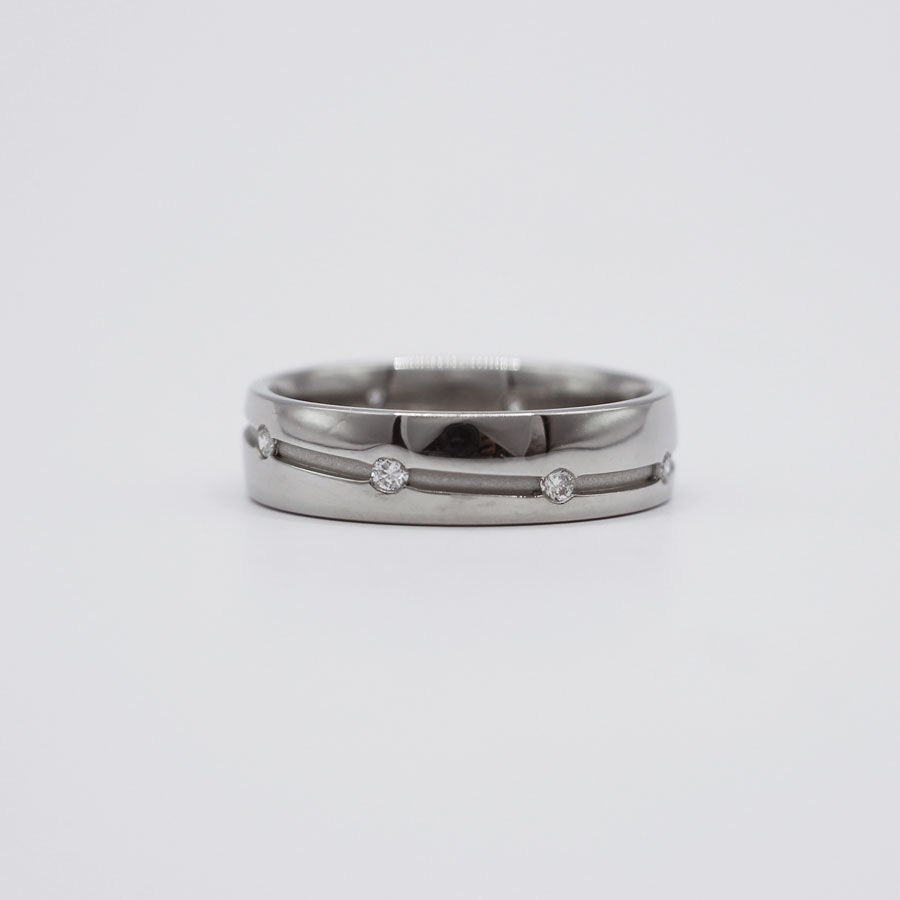 This sleek palladium ring features an asymmetrical ellipse channel detail connecting each of its eight glittering diamonds.