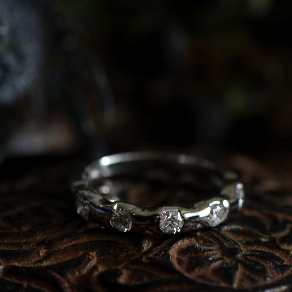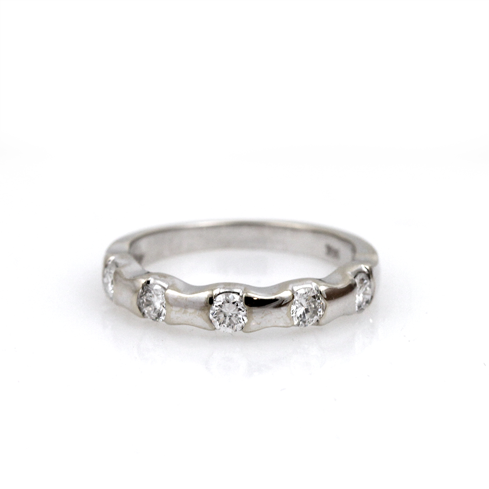 This unusual white gold ring features five diamonds nestled across its band. It would make an excellent wedding ring, anniversary ring, or stacking ring.