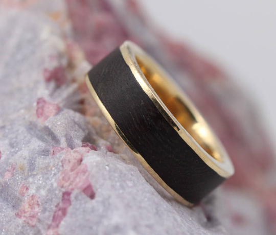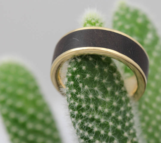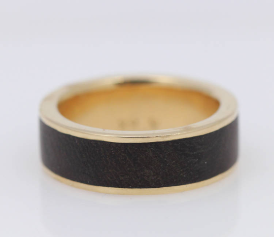 This sleek, understated ring features an ironwood inlay and rich yellow gold. With its minimalist flat profile, comfort fit interior, and polished finish, this could be an understated, unique wedding band. Handmade by us in our Ann Arbor, Michigan-based studio.
