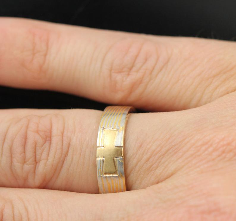 This mokume gane ring is crafted from platinum and 24K yellow gold, and adorned with a unique 14k yellow gold cross at the seam. Mokume gane is a traditional Japanese metalworking technique from the 17th century that consists of two or more precious metals that have been folded together to create a wood grain effect. Handmade by us in our Ann Arbor, Michigan-based studio.