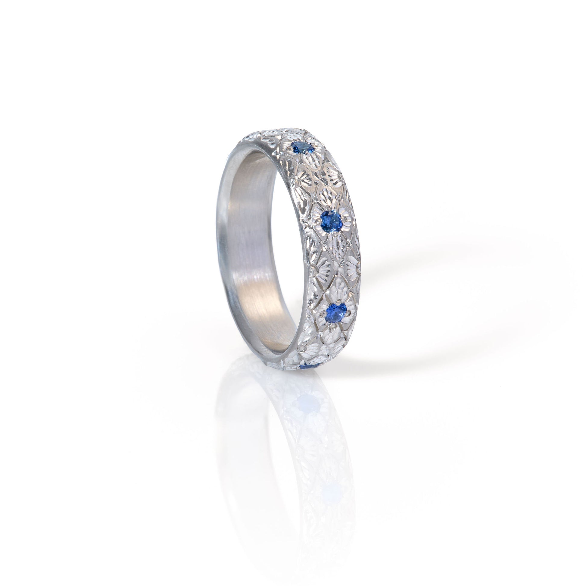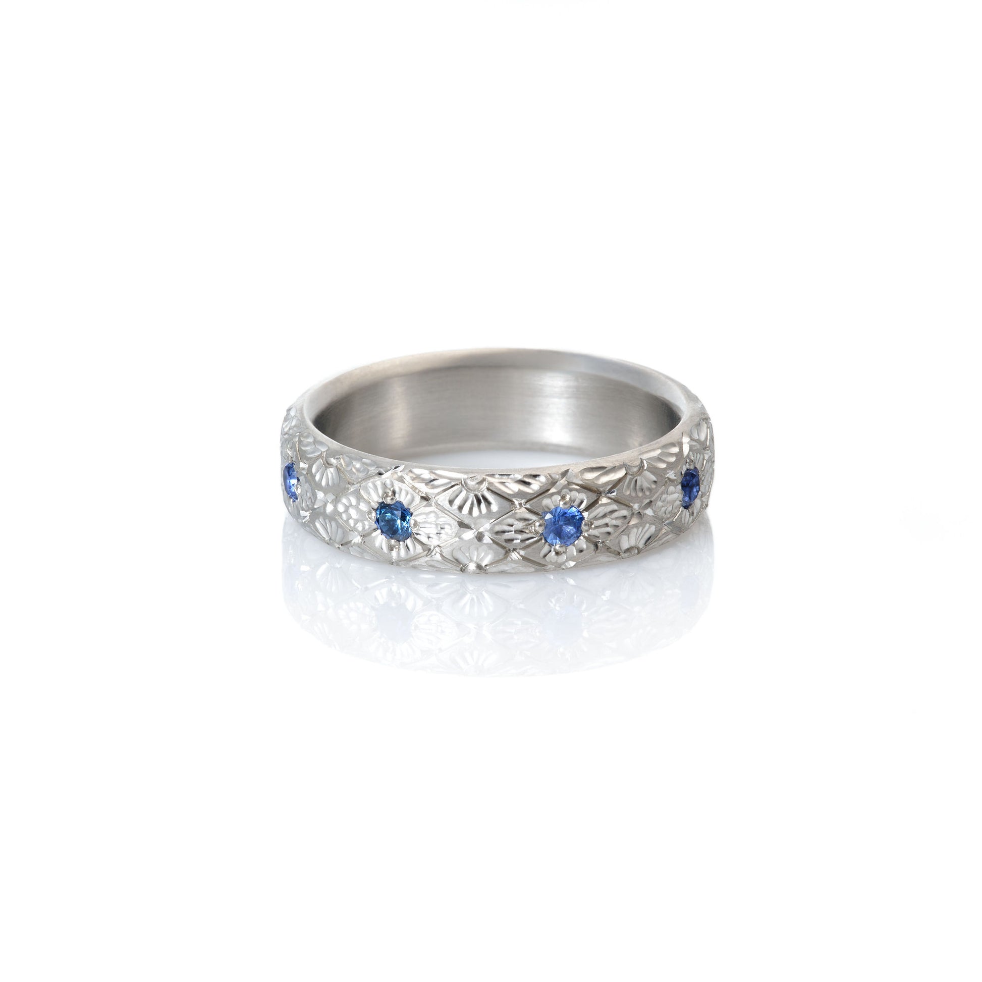 This lovely platinum band — part of Ryan Jewelry’s Forest Flower collection — is engraved with an ornate floral pattern, with a series of eight sparkling deep blue sapphires serving as the center of the flowers.